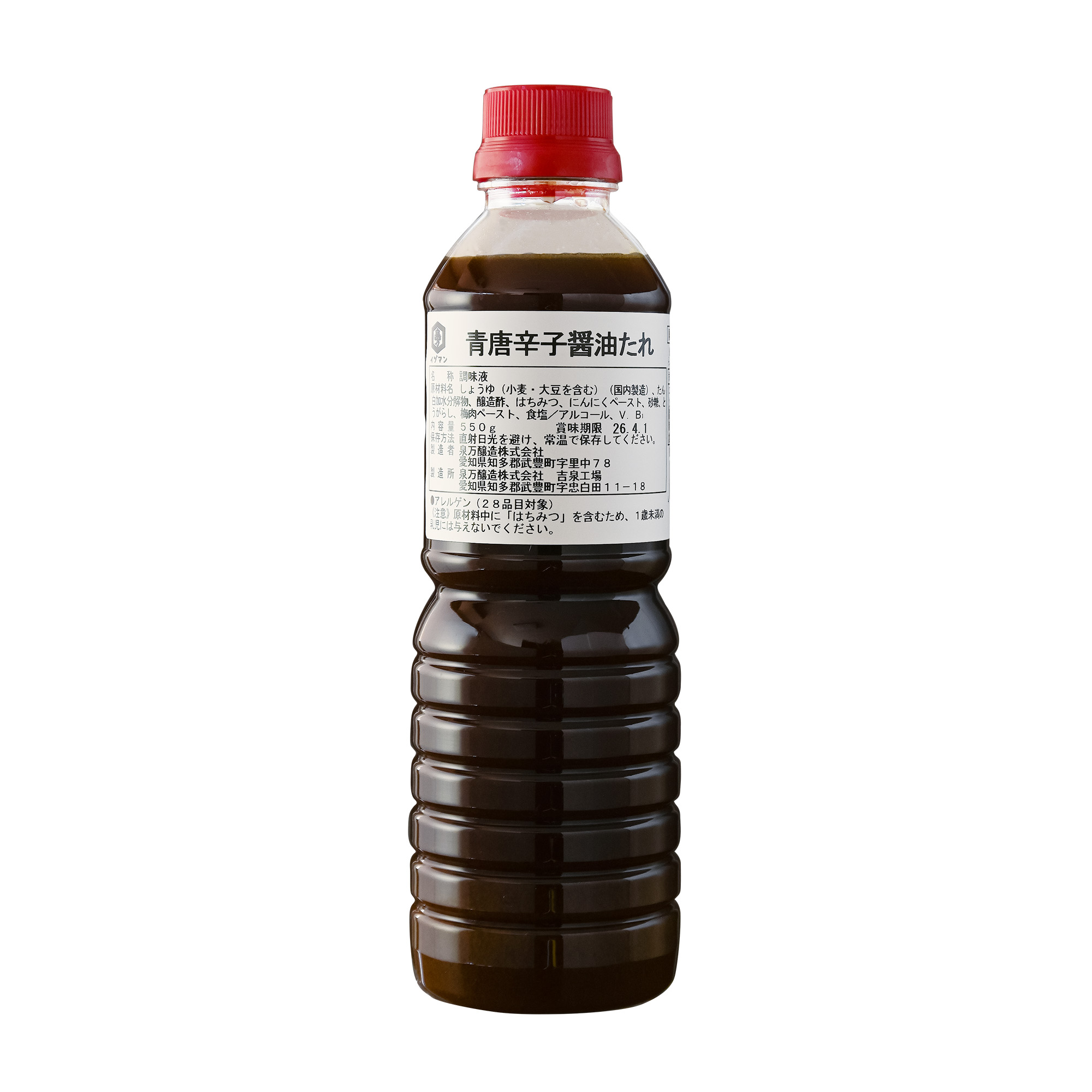 『青唐辛子醤油たれ 550g』は、うま味豊かなしょうゆに、はちみつ・にんにく・梅肉を加え、青唐辛子の風味をきかせた、“辛口万能調味料”。