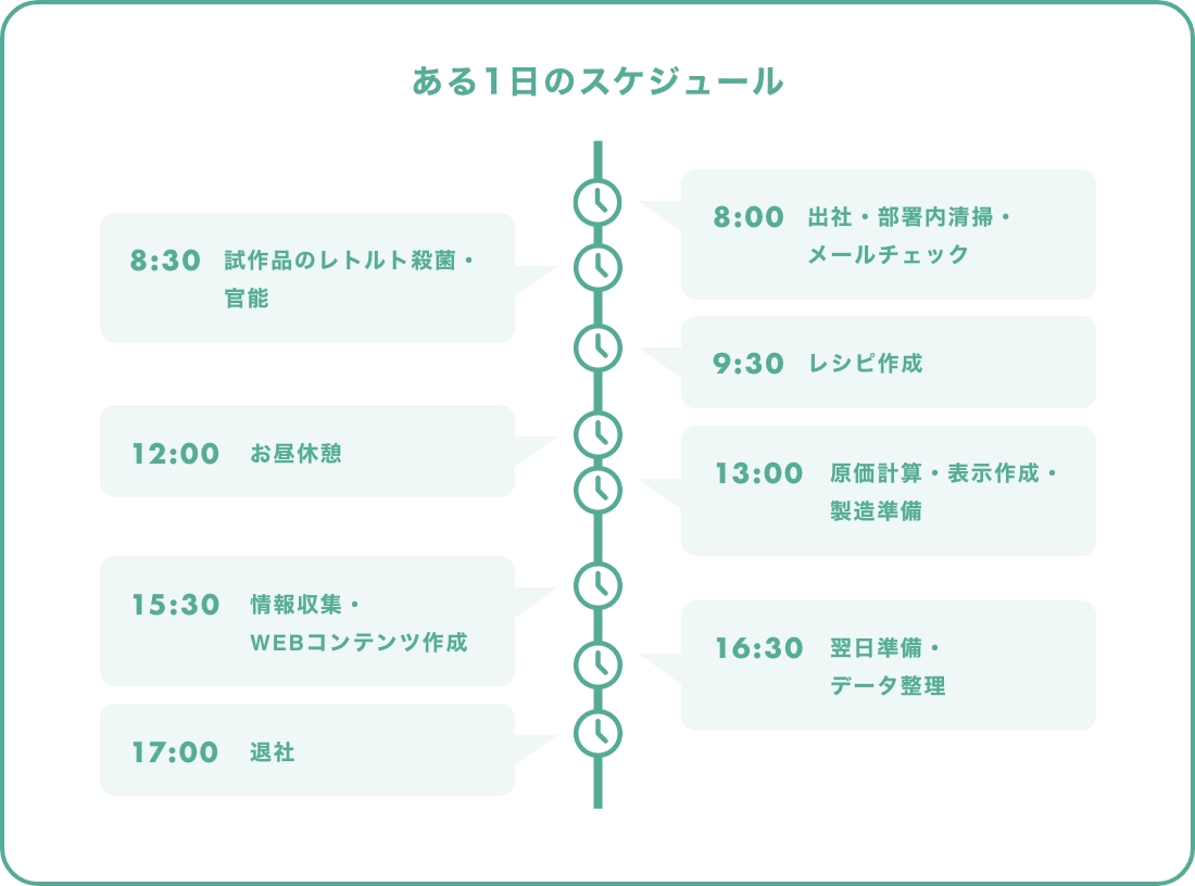 主に、パスタソースやスープといったレトルト食品の商品開発を担当しています。企業さんからのご依頼をもとに商品を考えてレシピを書いたり、製造が決定した商品の製造工程を考えたりしていますね。