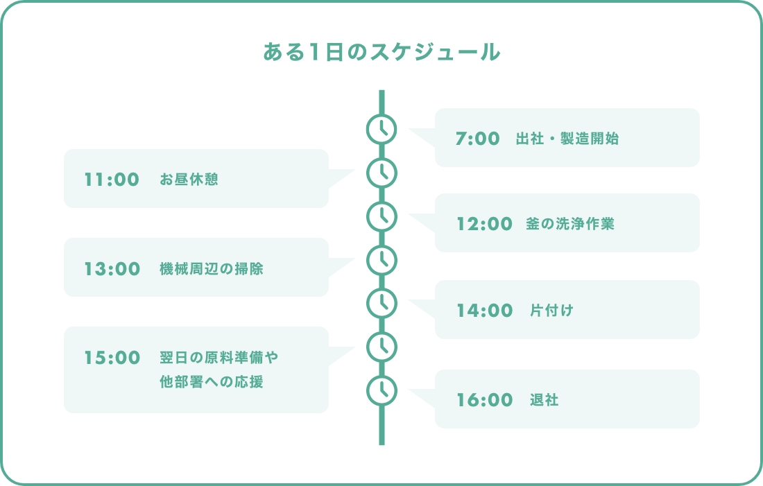 自分の好きな仕事で地域に貢献できていることです。私はものづくりが好きで、学校も工業系出身です。レシピによっては重い原料を運ぶこともあって大変ですが、100種類以上の製品に関われて、作った製品がお店に並んだり料理に使われていたりするのを見ると嬉しいです。